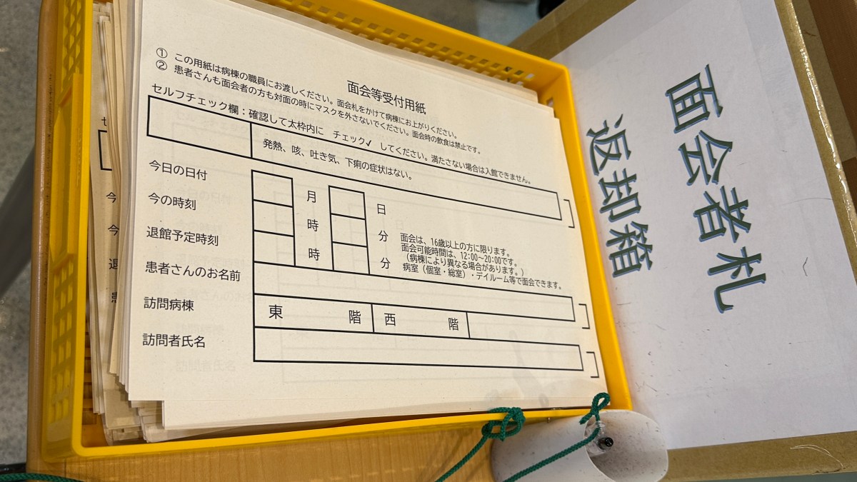 入退院に着いて行った家族などは入退院センターの入り口右側に置いてある「面会等受付用紙」に必要事項を書き込んで緑のひものついた面会者札を首からかけて病院内に入るようになっている。