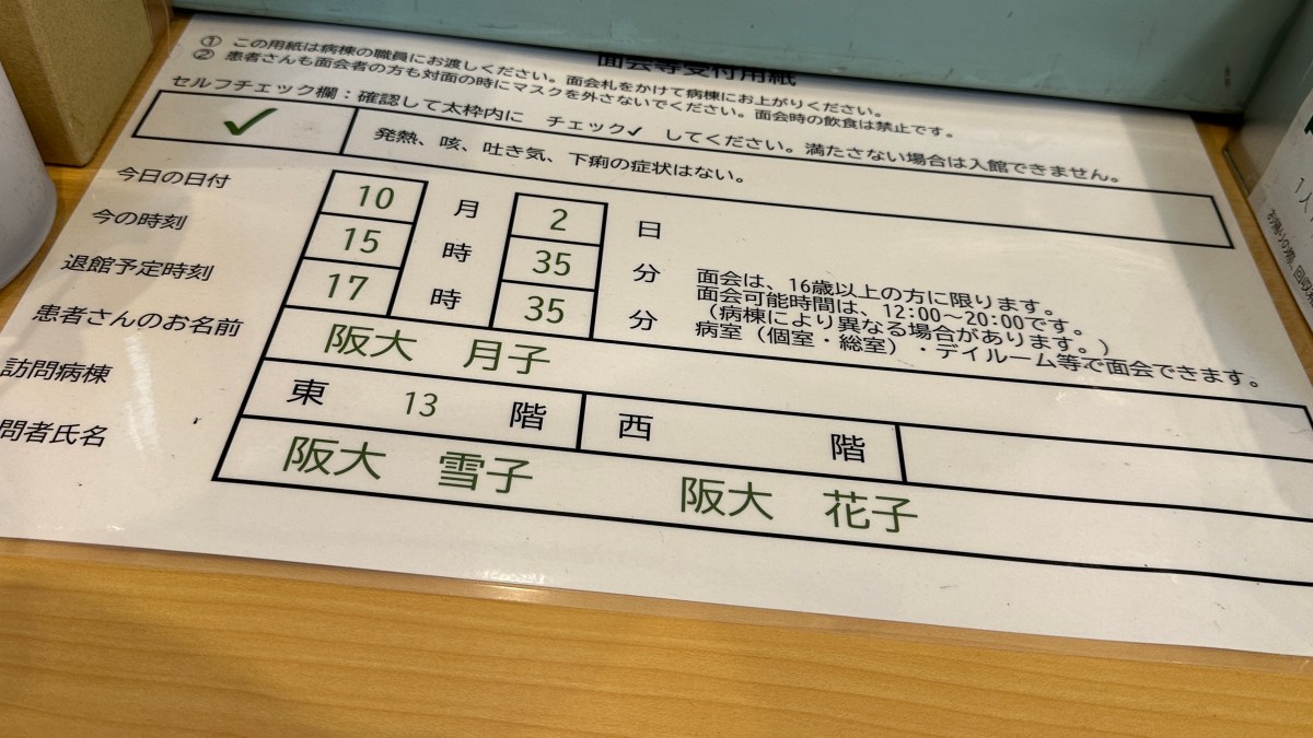 この面会者受付用紙に必要事項を書き込んでナースステーションに提出してから病室に入るようになっている。
